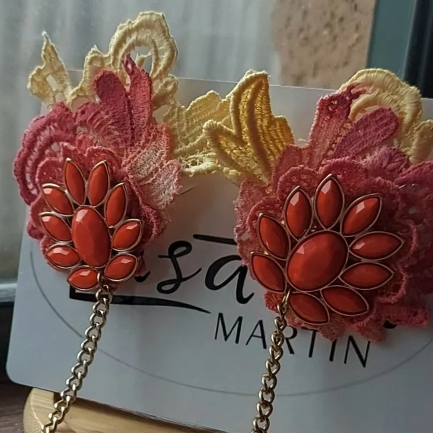 One-of-a-kind brooch Collar clip's displaying orange jeweled statement piece surrounded by lace.
